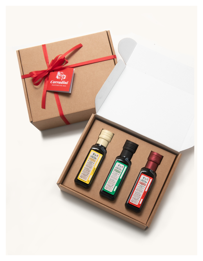 | Confezione: | Scatola regalo (dim. 23×19 H 7,5) con 3 bottiglie di vetro formato mignon; aromi a scelta |