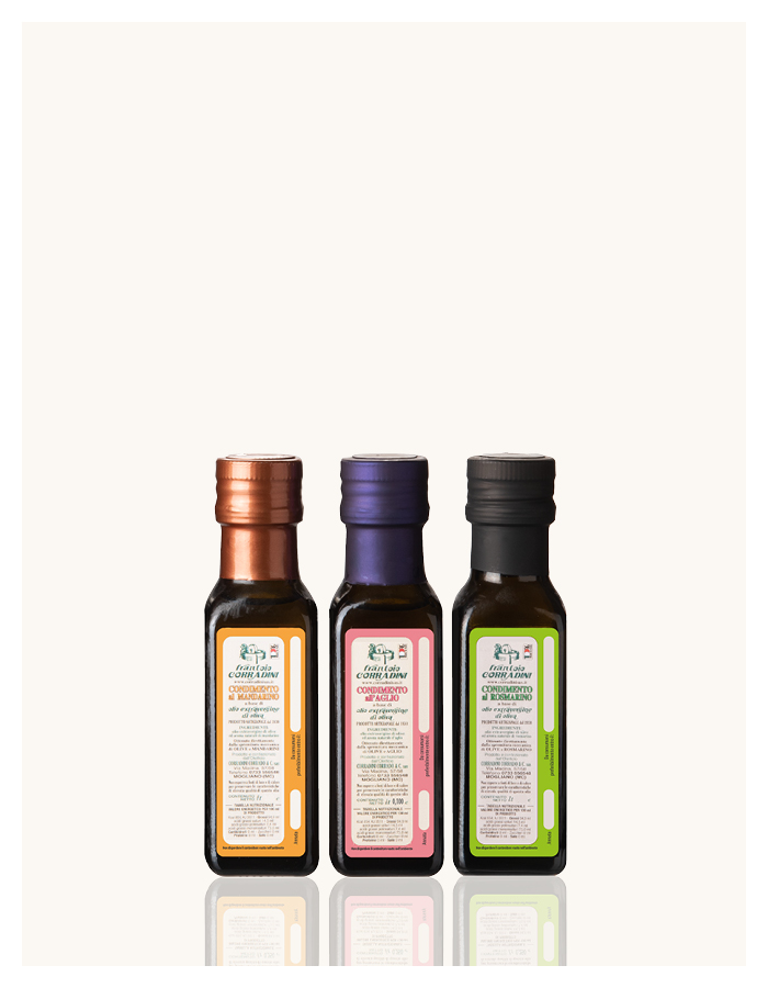 | Olio extravergine al MANDARINO: | Con il suo gusto ed aroma deciso si abbina perfettamente con molte insalate, abbinamenti agro-dolci e dessert! Adatto a tutte le cucina e alle cotture brevi. Grazie alla sua struttura leggera non sovrasta la personalità dei piatti marinari. |